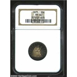 <TABLE cellSpacing=0 cellPadding=0 width="100%" bgColor=#000000 border=0><TBODY><TR><TD width="100%"><TABLE cellSpacing=1 cellPadding=3 width="100%" border=0><TBODY><TR><TD width="100%" bgColor=#79735c><FONT face=arial color=#ffffff size=3><B>Description</B> </FONT></TD></TR><TR><TD width="100%" bgColor=#ffffff><FONT face=arial size=2><B>1875 20C PR62 NGC.</B></I> Deep bands of electric-blue and ruby-red patina cede to light golden-brown centers. The obverse has a couple of miniscule contact marks, while the reverse is well preserved. An exquisitely struck specimen, and desirable as a proof type coin. </FONT></TD></TR></TBODY></TABLE></TD></TR></TBODY></TABLE><BR><A name=PricesRealized></A><TABLE cellSpacing=0 cellPadding=0 width="100%" bgColor=#000000 border=0><TBODY><TR><TD width="100%"><TABLE cellSpacing=1 cellPadding=3 width="100%" border=0><TBODY><TR><TD width="100%" bgColor=#79735c><A name=PR><FONT face=arial color=#ffffff size=3><B>Previous Prices from Heritage Auctions</B> </FONT></A></TD></TR><TR><TD bgColor=#f6f6ed><TABLE cellSpacing=0 cellPadding=0 width="100%" border=1><TBODY><TR><TD align=middle width="33%"><B>Date</B></TD><TD align=middle width="33%"><B>Service</B></TD><TD align=middle width="33%"><B>Price</B></TD></TR><TR bgColor=whitesmoke><TD width="33%"><B>08/08/2000</B></TD><TD width="33%">PCGS</TD><TD width="33%">$750.00</TD></TR><TR bgColor=whitesmoke><TD width="33%"><B>06/01/1996</B></TD><TD width="33%">PCGS</TD><TD width="33%">$1,210.00</TD></TR><TR bgColor=whitesmoke><TD width="33%"><B>03/16/1996</B></TD><TD width="33%">NGC</TD><TD width="33%">$852.50</TD></TR><TR bgColor=whitesmoke><TD width="33%"><B>08/05/2001</B></TD><TD width="33%">ANACS</TD><TD width="33%">$977.50</TD></TR></TBODY></TABLE></TD></TR><TR><TD bgColor=#ffffff><FONT face=arial size=1 ?>PLEASE NOTE: All prices realized reflect the final hammer price PLUS the buyer's premium in auctions that charge a buyer's premium. Each item has a notation at the top of the listing indicating whether that lot included a buyer's premium. Example: A item that sells with a final hammer price of $100 and a 20% buyer's premium will display with a price realized of $120. All information listed is intended to be as accurate as possible, but errors are possible. Please use this guide carefully and inform us of any inaccuracies. </FONT></TD></TR></TBODY></TABLE></TD></TR></TBODY></TABLE><BR><TABLE cellSpacing=0 cellPadding=0 width="100%" bgColor=#000000 border=0><TBODY><TR><TD width="100%"><TABLE cellSpacing=1 cellPadding=3 width="100%" border=0><TBODY><TR><TD width="100%" bgColor=#79735c colSpan=6><FONT face=arial color=#ffffff size=3><B>Price Guide*</B> </FONT></TD></TR><TR bgColor=#f6f6ed><TD align=middle><B>Grade</B> </TD><TD align=middle><B>Coin World<BR>(Trends)</B> </TD><TD align=middle><B>Numismedia<BR>Retail</B> </TD><TD align=middle><B>Numismedia<BR>Wholesale</B> </TD><TD align=middle><B>Coin<BR>Universe</B> </TD><TD align=middle><B>Heritage<BR>Value Index</B> </TD></TR><TR bgColor=#ffffff><TD align=middle>61</TD><TD align=right>---</TD><TD align=right>---</TD><TD align=right>$850.00</TD><TD align=right>---</TD><TD align=right>$1,083.00</TD></TR><TR style="FONT-WEIGHT: bold" bgColor=#cccfdd><TD align=middle>62</TD><TD align=right>---</TD><TD align=right>---</TD><TD align=right>$1,125.00</TD><TD align=right>---</TD><TD align=right>$1,234.25</TD></TR><TR bgColor=#ffffff><TD align=middle>63</TD><TD align=right>$2,250.00</TD><TD align=right>---</TD><TD align=right>$1,675.00</TD><TD align=right>$2,100.00</TD><TD align=right>$1,485.00</TD></TR><TR bgColor=#ffffff><TD colSpan=6><FONT size=1>*All information listed is intended to be as accurate as possible, but errors are possible. No item may be returned or refused based on this information which is provided as a service to our customers. You should contact each pricing source directly to determine the accuracy of this information. </FONT></TD></TR></TBODY></TABLE></TD></TR></TBODY></TABLE><BR><TABLE cellSpacing=0 cellPadding=0 width="100%" bgColor=#000000 border=0><TBODY><TR><TD width="100%"><TABLE cellSpacing=1 cellPadding=3 width="100%" border=0><TBODY><TR><TD width="100%" bgColor=#79735c><FONT face=arial color=#ffffff size=3><B>Population Guide</B> </FONT></TD></TR><TR bgColor=#ffffff><TD align=middle><!-- Begin Output of Population Grid--><TABLE cellSpacing=0 cellPadding=0 width="100%" border=0><TBODY><TR><TD vAlign=center><TABLE cellSpacing=0 width="100%" border=1 cellsadding="3"><TBODY><TR><TD vAlign=center><TABLE cellSpacing=0 cellPadding=3 width="100%" border=1><TBODY><TR><TD vAlign=center align=middle bgColor=#f0f1e8 colSpan=2 <CENTER><FONT face=Arial size=2><B>PCGS Pop </B></FONT><CENTER></CENTER></TD><TD vAlign=center align=middle bgColor=#f0f1e8 colSpan=2><CENTER><FONT face=Arial size=2><B>NGC Pop</B></CENTER></FONT></TD></TR><TR><TD vAlign=center><FONT face=Arial size=2>(62)</FONT> </TD><TD vAlign=center align=right><FONT face=Arial size=2>49</FONT> </TD><TD vAlign=center><FONT face=Arial size=2>(62)</FONT> </TD><TD vAlign=center align=right><FONT face=Arial size=2>27</FONT> </TD></TR><TR><TD vAlign=center><FONT face=Arial size=2>(>62)</FONT> </TD><TD vAlign=center align=right><FONT face=Arial size=2>154</FONT> </TD><TD vAlign=center><FONT face=Arial size=2>(>62)</FONT> </TD><TD vAlign=center align=right><FONT face=Arial size=2>109</FONT> </TD></TR></TBODY></TABLE></TD></TR></TBODY></TABLE></TD></TR></TBODY></TABLE><!-- End Output of Population Grid--> Important notice: Heritage usually auctions material at the rate of 200-250 lots per hour. On some occasions eBay Live bid software or the Internet may not be able to keep up with the pace of the auction. We recommend placing a realistic absentee bid now as insurance to avoid disappointment. Occasionally the auctioneer may eliminate or reject an eBay Live bid, and the auctioneer may also reopen a lot after the close of the eBay live bidding (usually because we missed an audience bid), and may reject your bid