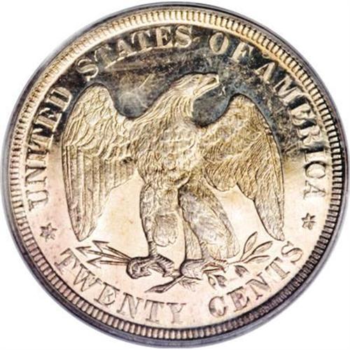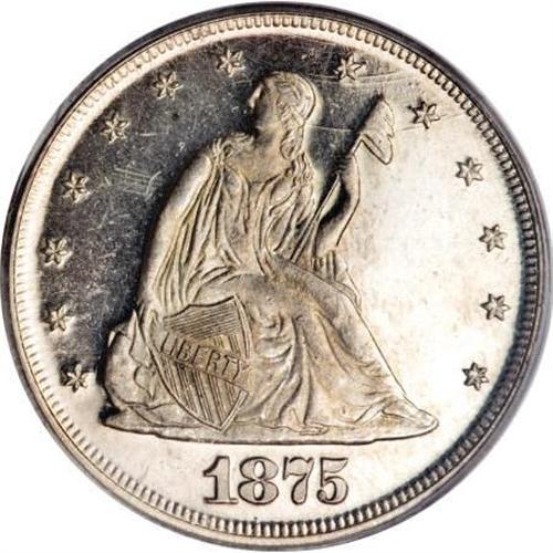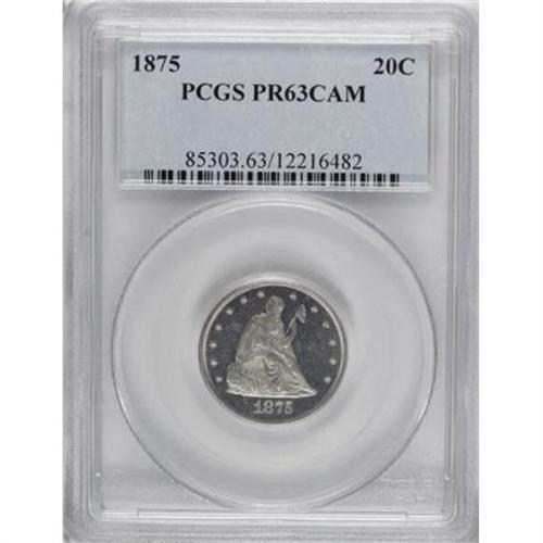 <B>1875 20C PR63 Cameo PCGS.</B></I> Seldom seen as a cameo, this is a spectacular type coin with profound field-to-device contrast. This first year of issue had a mintage of 2,790 pieces, but only the first few pieces off the dies show a cameo effect. The fields are deeply mirrored, and the obverse is nearly brilliant. The reverse shows just the slightest tinge of golden-rose color. Light scuffing in the fields accounts for the grade. Population: 15 in 63, 20 finer (12/07).<BR><BR><b>Shipping:</b> Coins & Currency (<a target="_blank" href="http://www.heritageauctions.com/common/shipping.php">view shipping information</a>)