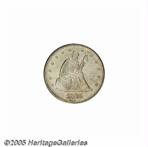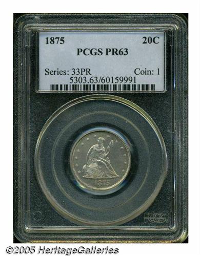 <B>1875<20C> PR63 PCGS.</B></I> Mostly brilliant except for a few irregular splotches of toning on the reverse. There are two or three faint hairline scratches, also located on the reverse.