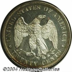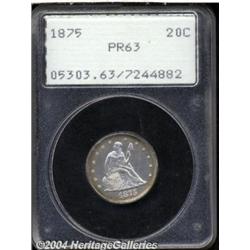 <B>1875<20C> PR63 PCGS.</B></I> First year of issue and always popular as such, this is an especially deeply mirrored example that shows a few light hairlines which account for the grade. Light mint frost is seen on the devices, and each side is brilliant except for a slight accent of golden toning around the peripheries. <BR><BR><B>Important notice:</B> Heritage usually auctions material at the rate of 200-250 lots per hour. On some occasions eBay Live bid software or the Internet may not be able to keep up with the pace of the auction. We recommend placing a realistic absentee bid now as insurance to avoid disappointment. Occasionally the auctioneer may eliminate or reject an eBay Live bid, and the auctioneer may also reopen a lot after the close of the eBay live bidding (usually because we missed an audience bid), and may reject your bid even if it shows you as the winning bidder. By bidding via eBay Live, you agree that Heritage may award the lot to another bidder at its sole discretion under the circumstances described above or any other reasonable circumstances. Since eBay bids are not shown to us until we open the lot on the floor, we treat those bids just like floor bids. In most cases the floor responds before the eBay bid is presented to us, due to Internet lag time, so for consistency we have made it a policy that floor bids are always considered first over tie eBay live bids. Also please note that all Heritage lots purchased through eBay Live carry a 20% Buyer's Premium. Please make sure you read the Terms and Conditions before you bid. </span></font></tr></table></td></tr></table>