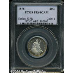 <table><tbody><tr><td><table> <TR><TD width="100%"><TABLE cellSpacing=1 cellPadding=3 width="100%" border=0><TBODY><TR><TD width="100%" bgColor=#79735c><FONT face=arial color=#ffffff size=3><B>Description</B> </FONT></TD></TR><TR><TD width="100%" bgColor=#ffffff><FONT face=arial size=2><B>1875 20C PR64 Cameo PCGS.</B></I> First year of issue and often used as a type coin, the 1875 is not quite as "common" as its mintage of 2,790 pieces might indicate. Apparently 590 pieces were still on hand in the Mint on January 1, 1876, and the usual fate of such leftover proofs was to be dumped in the melting pot. This is a mostly brilliant example that shows a slight edging of golden patina around the margins. The fields are moderately reflective, but the devices display a significant amount of mint frost that gives the coin its two-tone appearance. Population: 5 in 64, 5 finer (10/03). </FONT></TD></TR></TBODY></TABLE></TD></TR></TBODY></TABLE><BR><A name=PricesRealized></A><TABLE cellSpacing=0 cellPadding=0 width="100%" bgColor=#000000 border=0><TBODY><TR><TD width="100%"><TABLE cellSpacing=1 cellPadding=3 width="100%" border=0><TBODY><TR><TD width="100%" bgColor=#79735c><A name=PR><FONT face=arial color=#ffffff size=3><B>Previous Prices from Heritage Auctions</B> </FONT></A></TD></TR><TR><TD bgColor=#f6f6ed><TABLE cellSpacing=0 cellPadding=0 width="100%" border=1><TBODY><TR><TD align=middle width="33%"><B>Date</B></TD><TD align=middle width="33%"><B>Service</B></TD><TD align=middle width="33%"><B>Price</B></TD></TR><TR bgColor=whitesmoke><TD width="33%"><B>07/29/2003</B></TD><TD width="33%">NGC</TD><TD width="33%">$2,702.50</TD></TR></TBODY></TABLE></TD></TR><TR><TD bgColor=#ffffff><FONT face=arial size=1 ?>PLEASE NOTE: All prices realized reflect the final hammer price PLUS the buyer's premium in auctions that charge a buyer's premium. Each item has a notation at the top of the listing indicating whether that lot included a buyer's premium. Example: A item that sells with a final hammer price of $100 and a 20% buyer's premium will display with a price realized of $120. All information listed is intended to be as accurate as possible, but errors are possible. Please use this guide carefully and inform us of any inaccuracies. </FONT></TD></TR></TBODY></TABLE></TD></TR></TBODY></TABLE><BR><TABLE cellSpacing=0 cellPadding=0 width="100%" bgColor=#000000 border=0><TBODY><TR><TD width="100%"><TABLE cellSpacing=1 cellPadding=3 width="100%" border=0><TBODY><TR><TD width="100%" bgColor=#79735c colSpan=6><FONT face=arial color=#ffffff size=3><B>Price Guide*</B> </FONT></TD></TR><TR bgColor=#f6f6ed><TD align=middle><B>Grade</B> </TD><TD align=middle><B>Coin World<BR>(Trends)</B> </TD><TD align=middle><B>Numismedia<BR>Retail</B> </TD><TD align=middle><B>Numismedia<BR>Wholesale</B> </TD><TD align=middle><B>Coin<BR>Universe</B> </TD><TD align=middle><B>Heritage<BR>Value Index</B> </TD></TR><TR bgColor=#ffffff><TD align=middle>63</TD><TD align=right>---</TD><TD align=right>---</TD><TD align=right>---</TD><TD align=right>---</TD><TD align=right>$1,653.33</TD></TR><TR style="FONT-WEIGHT: bold" bgColor=#cccfdd><TD align=middle>64</TD><TD align=right>---</TD><TD align=right>---</TD><TD align=right>---</TD><TD align=right>---</TD><TD align=right>$3,038.33</TD></TR><TR bgColor=#ffffff><TD align=middle>65</TD><TD align=right>---</TD><TD align=right>---</TD><TD align=right>---</TD><TD align=right>$11,500.00</TD><TD align=right>$7,326.67</TD></TR><TR bgColor=#ffffff><TD colSpan=6><FONT size=1>*All information listed is intended to be as accurate as possible, but errors are possible. No item may be returned or refused based on this information which is provided as a service to our customers. You should contact each pricing source directly to determine the accuracy of this information. </FONT></TD></TR></TBODY></TABLE></TD></TR></TBODY></TABLE><BR><TABLE cellSpacing=0 cellPadding=0 width="100%" bgColor=#000000 border=0><TBODY><TR><TD width="100%"><TABLE cellSpacing=1 cellPadding=3 width="100%" border=0><TBODY><TR><TD width="100%" bgColor=#79735c><FONT face=arial color=#ffffff size=3><B>Population Guide</B> </FONT></TD></TR><TR bgColor=#ffffff><TD align=middle><!-- Begin Output of Population Grid--><TABLE cellSpacing=0 cellPadding=0 width="100%" border=0><TBODY><TR><TD vAlign=center><TABLE cellSpacing=0 width="100%" border=1 cellsadding="3"><TBODY><TR><TD vAlign=center><TABLE cellSpacing=0 cellPadding=3 width="100%" border=1><TBODY><TR><TD vAlign=center align=middle bgColor=#f0f1e8 colSpan=2 <CENTER><FONT face=Arial size=2><B>PCGS Pop </B></FONT><CENTER></CENTER></TD><TD vAlign=center align=middle bgColor=#f0f1e8 colSpan=2><CENTER><FONT face=Arial size=2><B>NGC Pop</B></CENTER></FONT></TD></TR><TR><TD vAlign=center><FONT face=Arial size=2>(64)</FONT> </TD><TD vAlign=center align=right><FONT face=Arial size=2>5</FONT> </TD><TD vAlign=center><FONT face=Arial size=2>(64)</FONT> </TD><TD vAlign=center align=right><FONT face=Arial size=2>6</FONT> </TD></TR><TR><TD vAlign=center><FONT face=Arial size=2>(>64)</FONT> </TD><TD vAlign=center align=right><FONT face=Arial size=2>5</FONT> </TD><TD vAlign=center><FONT face=Arial size=2>(>64)</FONT> </TD><TD vAlign=center align=right><FONT face=Arial size=2>7</FONT> </TD></TR></TBODY></TABLE></TD></TR></TBODY></TABLE></TD></TR></TBODY></TABLE><!-- End Output of Population Grid--></TD></TR></TBODY></TABLE></TD></TR></TBODY></TABLE><BR><TABLE cellSpacing=0 cellPadding=0 width="100%" bgColor=#000000 border=0><TBODY><TR> <font color='#000000'><span style='background-color: #FFFFFF'><td bgcolor='#FFFFFE'> Important notice: Heritage usually auctions material at the rate of 200-250 lots per hour. On some occasions eBay Live bid software or the Internet may not be able to keep up with the pace of the auction. We recommend placing a realistic absentee bid now as insurance to avoid disappointment. Occasionally the auctioneer may eliminate or reject an eBay Live bid, and the auctioneer may also reo