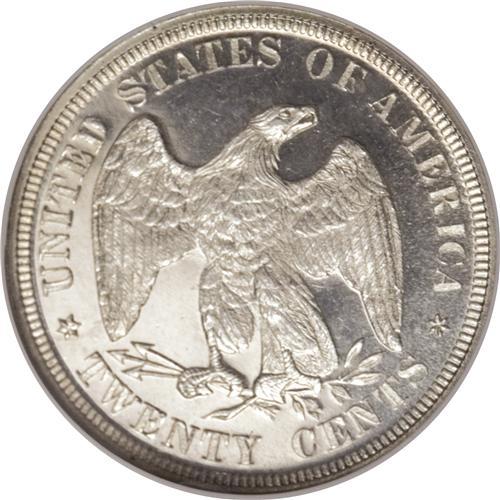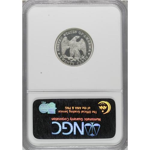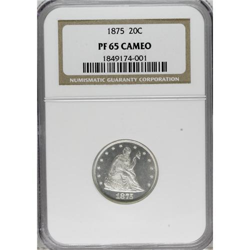 <B>1875 20C PR65 Cameo NGC.</B></I> The short-lived and poorly conceived twenty cent denomination was nonetheless represented by a considerable proof mintage in its premiere year amounting to 2,790 coins, nearly 8% of the total business strike mintage. This example offers silver-on-black contrast between the profoundly deep fields and the arctic-frosted devices. A few raised, curved die lines on the obverse are not to be confused with hairlines, as this remarkable type coin appears strictly original and lovingly well preserved. Census: 10 in 65 Cameo, 9 finer (4/07).<BR><BR><b>Shipping:</b> Coins & Currency (<a target="_blank" href="http://www.heritageauctions.com/common/shipping.php">view shipping information</a>)