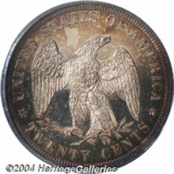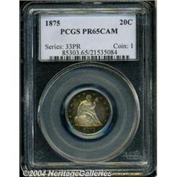 <B>1875<20C> PR65 Cameo PCGS.</B></I> The first year of issue for this short-lived type, and often used as a type coin, the 1875 is not quite as "common" as its mintage of 2,790 pieces might indicate. Apparently 590 pieces were still on hand in the Mint on January 1, 1876, and the usual fate of such leftover proofs was to be melted. The current offering is well struck, with a deep band of vivid electric-blue and purple-brown coloration near the obverse borders, golden-gray color near the centers of each side, and orange-gold iridescence near the reverse peripheries. Both obverse and reverse exhibit pleasing cameo contrast, with deeply reflective fields standing out behind beautifully frosted devices. Exquisitely preserved and seemingly distraction-free, this is a simply splendid cameo Gem proof. <BR><BR><B>Important notice:</B> Heritage usually auctions material at the rate of 200-250 lots per hour. On some occasions eBay Live bid software or the Internet may not be able to keep up with the pace of the auction. We recommend placing a realistic absentee bid now as insurance to avoid disappointment. Occasionally the auctioneer may eliminate or reject an eBay Live bid, and the auctioneer may also reopen a lot after the close of the eBay live bidding (usually because we missed an audience bid), and may reject your bid even if it shows you as the winning bidder. By bidding via eBay Live, you agree that Heritage may award the lot to another bidder at its sole discretion under the circumstances described above or any other reasonable circumstances. Since eBay bids are not shown to us until we open the lot on the floor, we treat those bids just like floor bids. In most cases the floor responds before the eBay bid is presented to us, due to Internet lag time, so for consistency we have made it a policy that floor bids are always considered first over tie eBay live bids. Also please note that all Heritage lots purchased through eBay Live carry a 20% Buyer's Premium. Please make sure you read the Terms and Conditions before you bid. </span></font></tr></table></td></tr></table>
