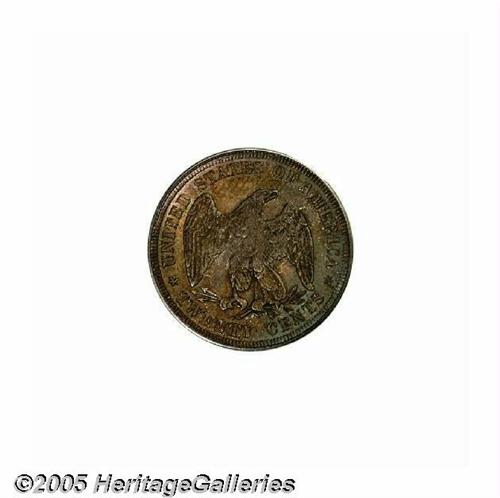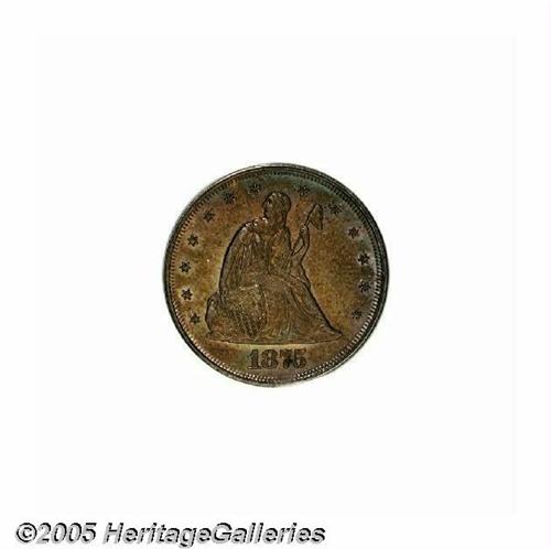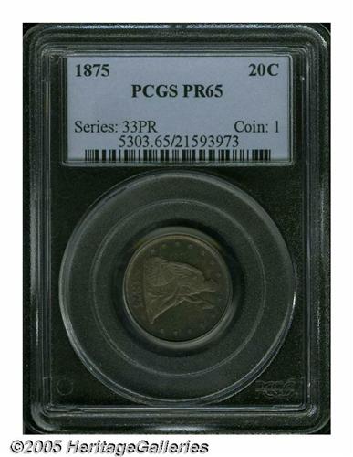 <B>1875<20C> PR65 PCGS.</B></I> The premier proof issue in the short-lived Twenty Cent series, the 1875 was produced to the extent of 2,790 pieces. A respectable total for the era, this issue is still, however, elusive at the finer levels of preservation. An uncommonly well preserved Gem, the surfaces display medium intensity dove-gray patina with splashes of light beige and steel-blue undertones. Nicely struck throughout, including strong definition in the eagle's left claw. There are no significant marks to report.
