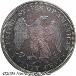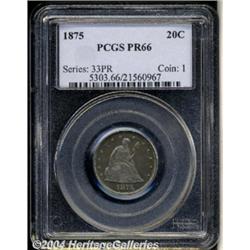 <B>1875<20C> PR66 PCGS.</B></I> Only 2,790 proofs were produced of this issue, a significant number for sure for proofs from this era; however, survivors are scarcer than any of the other proofs produced in this series, all of which have lower mintages. The 1875 is especially elusive in such a superlative state of preservation as this, with only 11 other pieces so graded by PCGS and one finer (7/04). Obviously an original coin, the fields show unfathomable depth of mirrored reflectivity on each side, reflectivity that is unaffected by the deep sea-green and deep maroon toning that is seen overall. An exceptional and rarely offered opportunity for the specialist.<BR><I>From The Harold W. Anderson Collection, Part Two.</B></I> <BR><BR><B>Important notice:</B> Heritage usually auctions material at the rate of 200-250 lots per hour. On some occasions eBay Live bid software or the Internet may not be able to keep up with the pace of the auction. We recommend placing a realistic absentee bid now as insurance to avoid disappointment. Occasionally the auctioneer may eliminate or reject an eBay Live bid, and the auctioneer may also reopen a lot after the close of the eBay live bidding (usually because we missed an audience bid), and may reject your bid even if it shows you as the winning bidder. By bidding via eBay Live, you agree that Heritage may award the lot to another bidder at its sole discretion under the circumstances described above or any other reasonable circumstances. Since eBay bids are not shown to us until we open the lot on the floor, we treat those bids just like floor bids. In most cases the floor responds before the eBay bid is presented to us, due to Internet lag time, so for consistency we have made it a policy that floor bids are always considered first over tie eBay live bids. Also please note that all Heritage lots purchased through eBay Live carry a 20% Buyer's Premium. Please make sure you read the Terms and Conditions before you bid. </span></font></tr></table></td></tr></table>