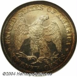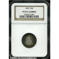 <B>1875<20C> PR67 <S Cameo NGC.</B></I> The popularity of this issue is immense, being that it is the premier date in the proof Twenty Cent series. The 1875 is also a prime type candidate with the highest proof mintage (2,790 pieces) of the type. Not all of these coins appear to have been released, however, with Breen (1977) noting that 590 specimens were still in Mint holdings on January 1, 1876. The fate of these coins is not known with certainty, but melting on the authority of Mint officials is a likely result. Breen also reports only one die marriage among survivors, this being most readily identifiable by the presence of random arcing striations (as produced) in the obverse field around Liberty's head. While the currently offered Superb Gem displays these features, its surfaces are silent on the subject of post-production distractions. Deep pleasing crimson, russet, and electric-blue iridescence adorns the peripheral regions, while the fully frosted devices have a faint golden-beige tint. Noticeable reflectivity in the fields permits appealing, mild cameo contrast to be appreciable on both obverse and reverse. Only one piece has been graded at PR67, by NGC, with both the Cameo and "Star" designations, with none finer, and PCGS has yet to grade a single Cameo proof above PR66. <BR><BR><B>Important notice:</B> Heritage usually auctions material at the rate of 200-250 lots per hour. On some occasions eBay Live bid software or the Internet may not be able to keep up with the pace of the auction. We recommend placing a realistic absentee bid now as insurance to avoid disappointment. Occasionally the auctioneer may eliminate or reject an eBay Live bid, and the auctioneer may also reopen a lot after the close of the eBay live bidding (usually because we missed an audience bid), and may reject your bid even if it shows you as the winning bidder. By bidding via eBay Live, you agree that Heritage may award the lot to another bidder at its sole discretion under the circumstances described above or any other reasonable circumstances. Since eBay bids are not shown to us until we open the lot on the floor, we treat those bids just like floor bids. In most cases the floor responds before the eBay bid is presented to us, due to Internet lag time, so for consistency we have made it a policy that floor bids are always considered first over tie eBay live bids. Also please note that all Heritage lots purchased through eBay Live carry a 20% Buyer's Premium. Please make sure you read the Terms and Conditions before you bid. </span></font></tr></table></td></tr></table>
