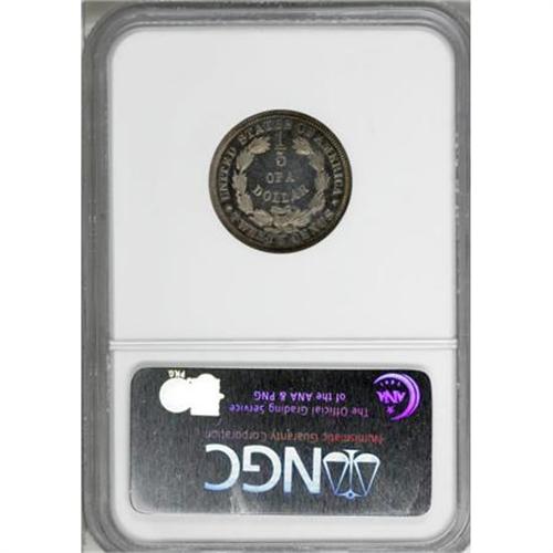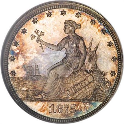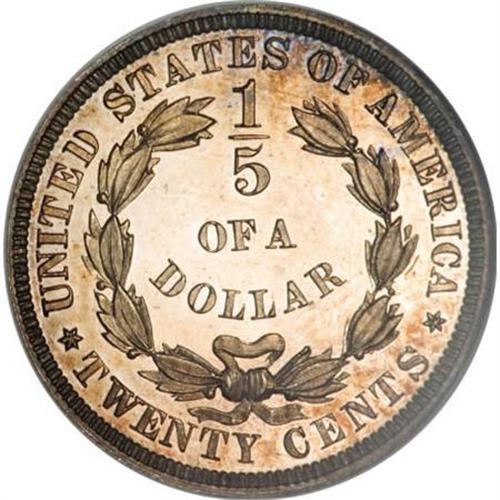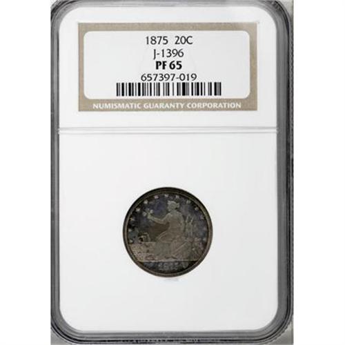 <B>1875 20C Twenty Cents, Judd-1396, Pollock-1539, High R.7, PR65 NGC.</B></I> Liberty by the Seashore is the name most often give to this obverse design. The reverse has the denomination expressed in fractional form as 1/5 Of A DOLLAR. Struck in silver with a plain edge. According to Andrew Pollock: "This design has been the object of much mirth with collectors, because although the smoke is trailing behind the ship, the sails are billowed in the forward direction, a fact first pointed out Q. David Bowers." It seems to us that the smoke should actually appear to rise straight up. The wind is blowing to the east and billowing the sails, causing the ship to move at a similar speed. The wind is also therefore blowing the smoke forward, but the motion of the ship in the water should counteract this, causing the smoke to rise. Of course, in reality the design is actually properly executed, in our opinion, as the smoke from the stack indicates the use of supplemental power moving the ship at a much faster speed than the wind, thus the smoke should be trailing behind as it is depicted. This example is a Gem with exceptional mirrored fields and delightful light gold toning.<BR><BR><b>Shipping:</b> Coins & Currency (<a target="_blank" href="http://www.heritageauctions.com/common/shipping.php">view shipping information</a>)