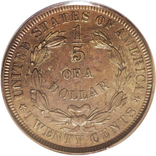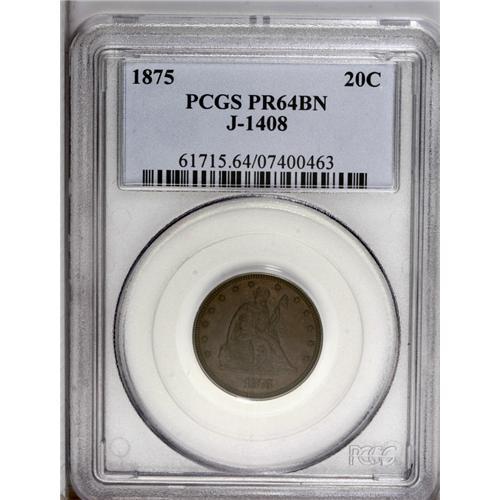 <B>1875<20C> Twenty Cents, Judd-1408, Pollock-1551, Low R.7, PR64 Brown PCGS.</B></I> The obverse is similar to the as-issued design, except the date is smaller and LIBERTY is incuse. The reverse features a wreath, and expresses the denomination with two different legends, TWENTY CENTS and 1/5 OF A DOLLAR. Struck in copper with a plain edge. A meticulously struck and unblemished specimen, generally medium-brown but with a few hints of lighter tan toning. Population: 1 in 64 Brown, 3 finer (7/06).