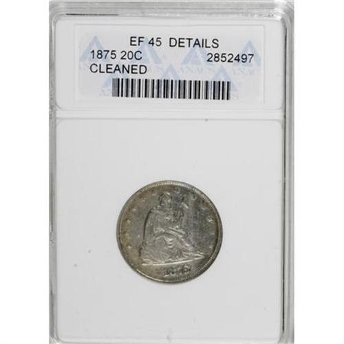 <B>1875 20C --Cleaned--ANACS. XF45 Details.</B></I> NGC Census: (6/247). PCGS Population (28/331). Mintage: 36,900. Numismedia Wsl. Price for NGC/PCGS coin in XF45: $357. (#5296)<BR><BR><B>Coin Engraver:</B> William Barber<BR><BR><b>Shipping:</b> Coins & Currency (<a target="_blank" href="http://www.heritageauctions.com/common/shipping.php">view shipping information</a>)
