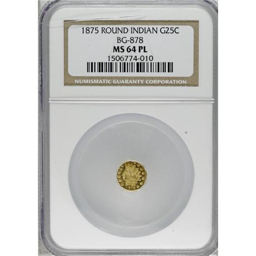 <B>1875 25C Indian Round 25 Cents, BG-878, R.3, MS64 Prooflike NGC.</B></I> This is a pleasingly prooflike near-Gem example of this round gold quarter dollar issue. Well struck and nicely preserved, the piece shows a pair of thick die cracks (as struck) on the Indian's face and a few wispy die lines on the reverse.<BR><BR><b>Shipping:</b> Coins & Currency (<a target="_blank" href="http://www.heritageauctions.com/common/shipping.php">view shipping information</a>)