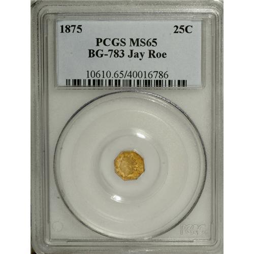 <B>1875 25C Indian Octagonal 25 Cents, BG-783, R.5, MS65 PCGS.</B></I> Ex: Jay Roe. A beautiful pumpkin-gold Gem that boasts crisp legends and brightly mirrored fields. The plate coin for the variety in the second edition of Breen-Gillio. Population: 2 in 65, 0 finer (3/07).<BR><I>Ex: Jay Roe Collection (Bowers and Merena, 9/03), lot 229.</B></I><BR><BR><b>Shipping:</b> Coins & Currency (<a target="_blank" href="http://www.heritageauctions.com/common/shipping.php">view shipping information</a>)