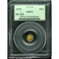 <B>1875 25C Indian Octagonal 25 Cents, BG-783, R.5, MS63 PCGS.</B></I> A scarce variety with no bow on the wreath and no ribbon above the 7 in the date. D in DOLLAR is double punched. Well struck and prooflike with a well preserved obverse and a few faint handling marks on the reverse. Population: 8 in 63, 7 finer (1/05). Lot:9791