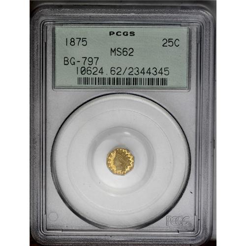 <B>1875<25C> Indian Octagonal 25 Cents, BG-797, Low R.4, MS62 PCGS.</B></I> A wide, even date identifies this available Period Two issue. Pleasing for the grade, and graced with orange and lime tints. Struck from moderately rotated dies, and encased in a green label holder.