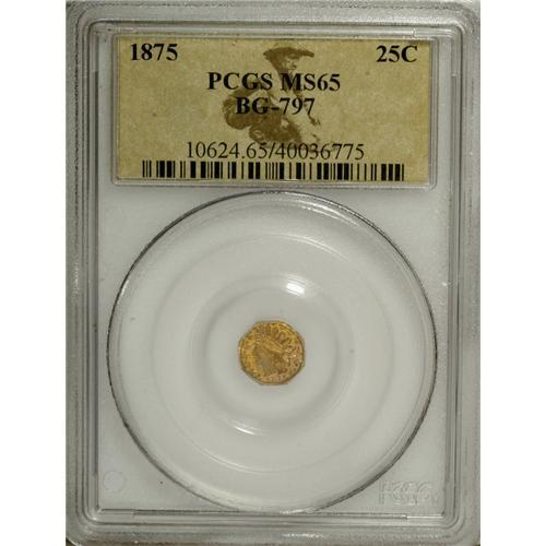 <B>1875 25C Indian Octagonal 25 Cents, BG-797, Low R.4, MS65 PCGS.</B></I> PCGS Population (20/1). NGC Census: (0/0). (#10624)<BR><BR><b>Shipping:</b> Coins & Currency (<a target="_blank" href="http://www.heritageauctions.com/common/shipping.php">view shipping information</a>)
