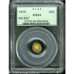 <B>1875 25C Indian Round 25 Cents, BG-847, R.4, MS64 PCGS.</B></I> Greenish-gold patina and well struck devices. The fields are semi-prooflike, especially on the obverse. Population: 20 in 64, 2 finer (1/05). Lot:9802