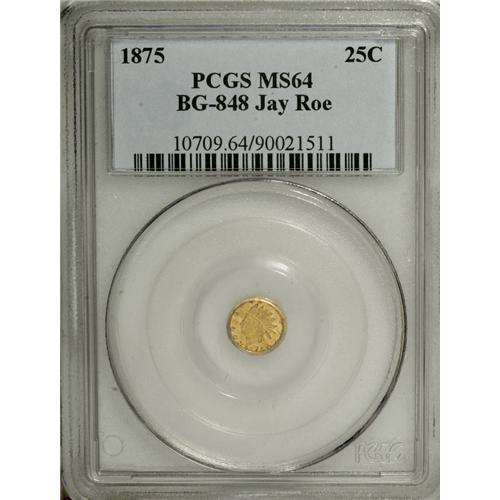 <B>1875 25C Indian Round 25 Cents, BG-848, Low R.7, MS64 PCGS.</B></I> Ex: Jay Roe. This sharply impressed and unblemished sun-gold near-Gem provides reflective fields and pleasing eye appeal. Slightly wavy, as made. The plate coin for the variety in the second edition of Breen-Gillio. Population: 3 in 64, 0 finer (3/07).<BR><I>Ex: Jay Roe Collection (Bowers and Merena, 9/03), lot 331.</B></I><BR><BR><b>Shipping:</b> Coins & Currency (<a target="_blank" href="http://www.heritageauctions.com/common/shipping.php">view shipping information</a>)