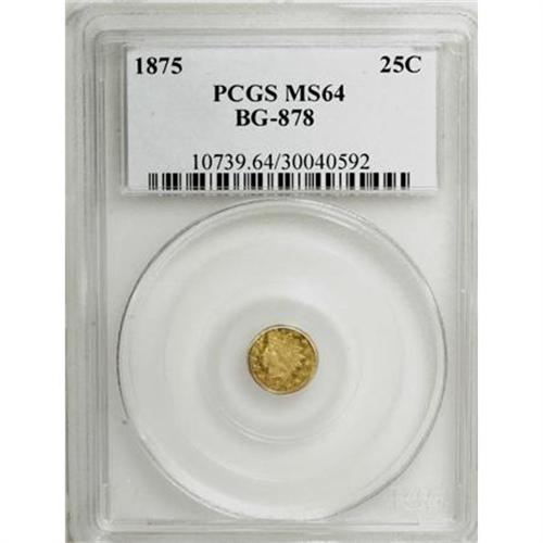 <B>1875 25C Indian Round 25 Cents, BG-878, R.3, MS64 PCGS.</B></I> PCGS Population (46/13). NGC Census: (6/0). (#10739)<BR><BR><b>Shipping:</b> Coins & Currency (<a target="_blank" href="http://www.heritageauctions.com/common/shipping.php">view shipping information</a>)