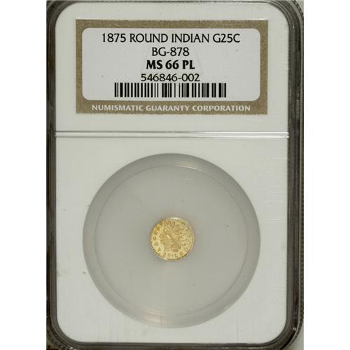 <B>1875 25C Indian Round 25 Cents, BG-878, R.3, MS66 Prooflike NGC.</B></I> Die State II with a "Scarface" die crack across the cheek. The flashy fields are exceptionally mirrored, and this well struck honey-gold premium Gem has superior eye appeal. An extremely high grade for any small-denomination private gold piece.<BR><I>From The Diamond K Collection of California Fractional Gold.</B></I><BR><BR><b>Shipping:</b> Coins & Currency (<a target="_blank" href="http://www.heritageauctions.com/common/shipping.php">view shipping information</a>)