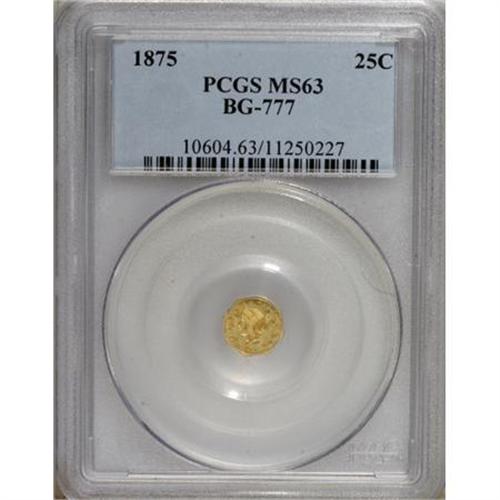 <B>1875 25C Liberty Octagonal 25 Cents, BG-777, Low R.7, MS63 PCGS.</B></I> A flashy green-tinged Select example of this rare variety. Well struck with a pleasing appearance. PCGS has certified only eight examples in all grades. Population: 1 in 63, 0 finer (1/07).<BR><BR><b>Shipping:</b> Coins & Currency (<a target="_blank" href="http://www.heritageauctions.com/common/shipping.php">view shipping information</a>)