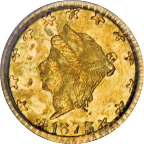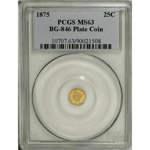 <B>1875 25C Liberty Round 25 Cents, BG-846, R.6, MS63 PCGS.</B></I> A couple of alternating brilliant and frosty areas on the reverse identify this as the<B> plate coin in the Breen-Gillio second edition, </B></I>as does the PCGS encapsulation! This piece shows the "dent-like ghosts on the obverse," as Breen-Gillio calls them, with considerable clash marks in evidence and some minor planchet flaws. Population: 2 in 63, 0 finer (12/07).<BR><BR><b>Shipping:</b> Coins & Currency (<a target="_blank" href="http://www.heritageauctions.com/common/shipping.php">view shipping information</a>)