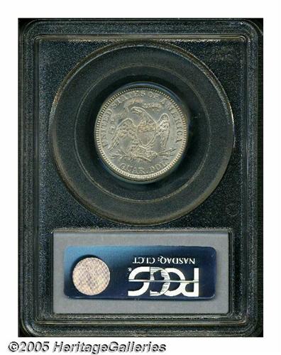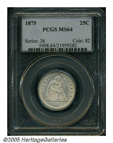<B>1875<25C> MS64 PCGS.</B></I> Boldly struck with pleasing luster, chalky gray-white color, a few wispy field marks on each side of the coin, and faintly noticeable die clash marks (as struck) in the obverse and reverse fields. An attractive near-Gem. Population: 48 in 64, 40 finer (4/05).