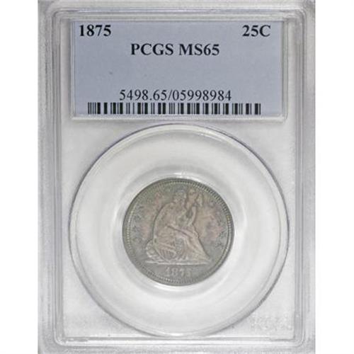 <B>1875 25C MS65 PCGS.</B></I> Type One Reverse. Richly toned and delightful, with waves of sea-green and violet that show occasional rose accents. Solidly struck with remarkable eye appeal. Despite a comparatively high mintage for the series, the 1875 remains elusive in Gem. Population: 29 in 65, 19 finer (12/07).<BR><BR><B>Coin Engraver:</B> Christian Gobrecht<BR><BR><b>Shipping:</b> Coins & Currency (<a target="_blank" href="http://www.heritageauctions.com/common/shipping.php">view shipping information</a>)