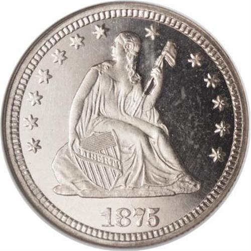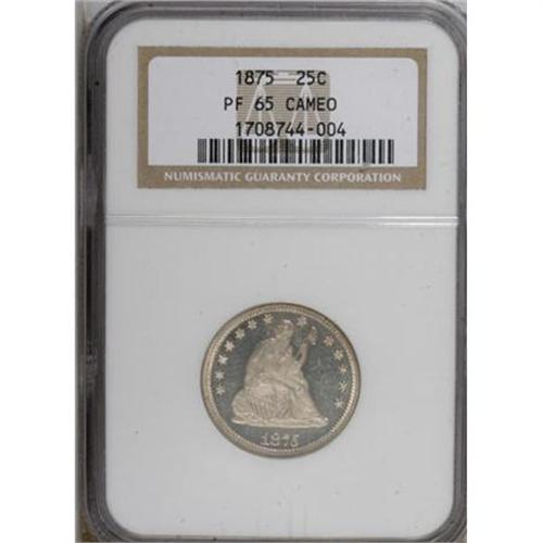 <B>1875 25C PR65 Cameo NGC.</B></I> Type One Reverse. Larry Briggs (1991) writes: "Auction sales over the last decade show the 1875 proof quarter to be the rarest proof quarter of either the 1870's or 1880's proof quarters! Possibly the mintage being incorrect or many proofs of this year being melted. Regardless quite elusive and underrated." We would add that Gem-quality Cameos, such as the example in this lot, are especially difficult to locate, as the census figures below indicate. The pronounced field-motif contrast on this untoned example is evident at all angles, and the design elements are sharply struck, save for the usual weakness in most of the star centers. Close examination reveals no disturbing marks. Census: 6 in 65 Cameo, 2 finer (10/07).<BR><BR><b>Shipping:</b> Coins & Currency (<a target="_blank" href="http://www.heritageauctions.com/common/shipping.php">view shipping information</a>)