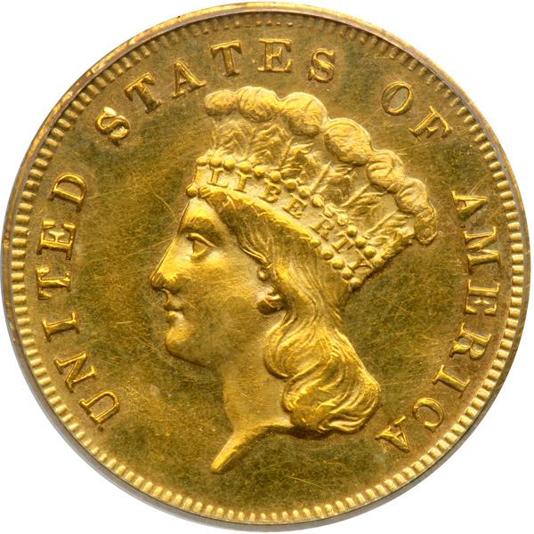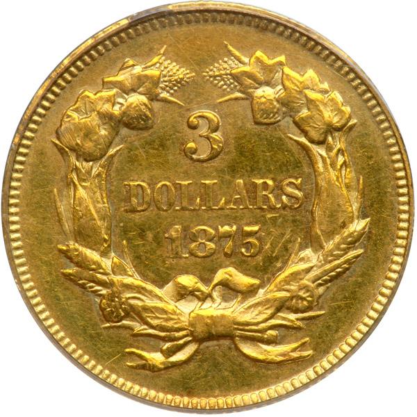 1875. PCGS graded Proof 60. Lots of flashy proof surface and overlaid with attractive light golden toning. This is the Key Date to the entire series. Only 20 struck for this Proof-only year. This is the first of two years in the Three-Dollar gold series that witnessed the production of only Proof coins. Exactly how many 1875 Threes were delivered is unknown, despite the fact that the Guide Book lists an "official" mintage of 20 pieces. We believe that this figure actually is official, inasmuch as it represents the number of specimens delivered on February 13, 1875 for sale with the year's gold Proof sets. Given the fact that approximately 28-35 coins are believed extant (per Bowers and Winter, 2005), additional examples must have been prepared at a later date, and they were probably sold individually.