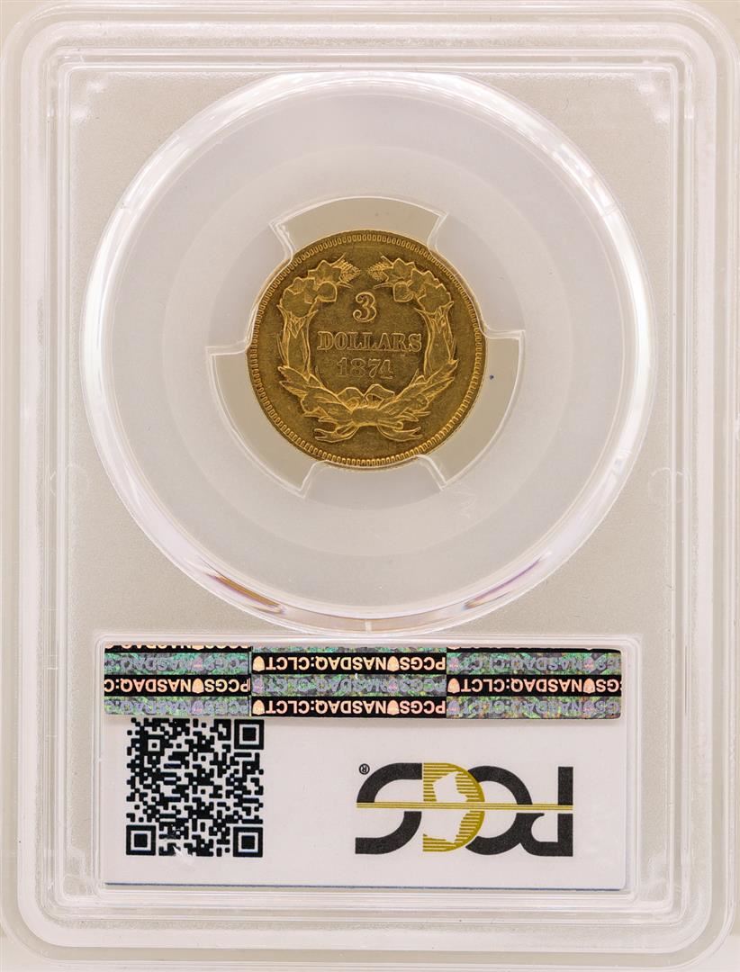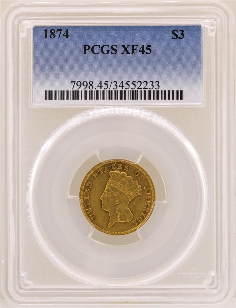 One 1875 $3 Indian Princess Head Gold Coin PCGS XF45. PCGS Graded.