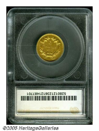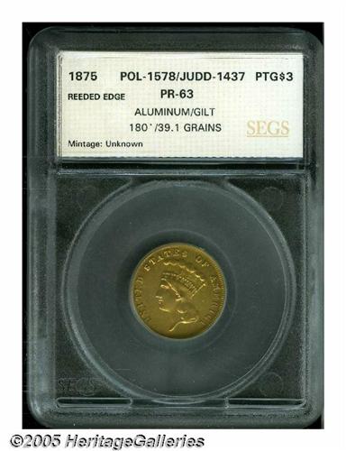 <B>1875<$3> Three Dollar, Judd-1437, High R.7, (Proof 60 Cleaned) PR63 SEGS.</B></I> 39.1 grains. A regular dies trial piece for the three dollar gold piece. Struck in aluminum and gilt with a reeded edge. Saul Teichman notes that: "The die trials of this date often have been gilded due to the extreme rarity of its gold counterpart." Of course, the 1875 three dollar is one of the great rarities among 19th century U.S. gold. That rarity has an approximate survivorship in the range of 31-33 pieces in all grades (all proofs), an uncertain number of which are restrikes. This pattern is much rarer than a proof 1875 three dollar, but because it is not struck in gold alloy it is not valued as highly by as wide an audience as a gold coin. This piece is obviously gilt with each side somewhat dull gold in color, as one would expect from a gilt coin. The surfaces show a curious fine-grain texture, which we attribute to the gilding process and the coin appears to have been lightly cleaned at one time. A bit softly struck over the highpoints of the design, but there are no obvious or distracting marks present.