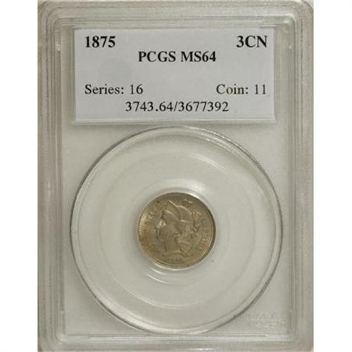 <B>1875 3CN MS64 PCGS.</B></I> PCGS Population (61/39). NGC Census: (89/47). Mintage: 227,300. Numismedia Wsl. Price for NGC/PCGS coin in MS64: $276. (#3743)<BR><BR><B>Coin Engraver:</B> James B. Longacre<BR><BR><b>Shipping:</b> Coins & Currency (<a target="_blank" href="http://www.heritageauctions.com/common/shipping.php">view shipping information</a>\)