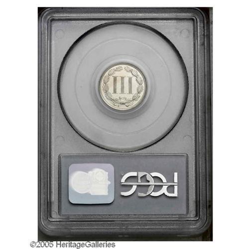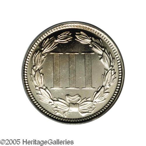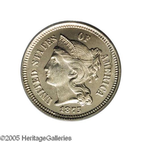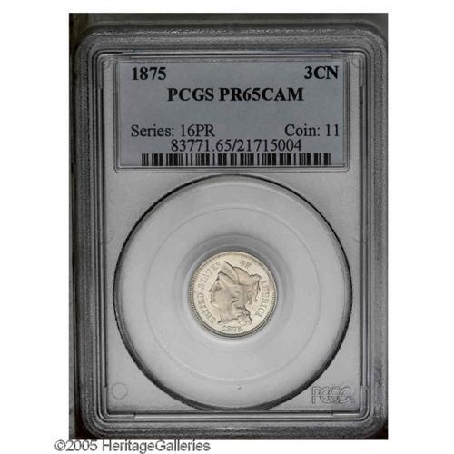 <B>1875<3CN> PR65 Cameo PCGS.</B></I> Essentially brilliant with more noticeable contrast on the obverse. As with other specimens we have seen from this year, there is a tiny lump of extra metal on the cheek of Liberty. Population: 7 in 65 Cameo, 2 finer (11/05).<BR><I>From The David R. Poole Registry Collection of Proof Three Cent Nickels.</B></I>