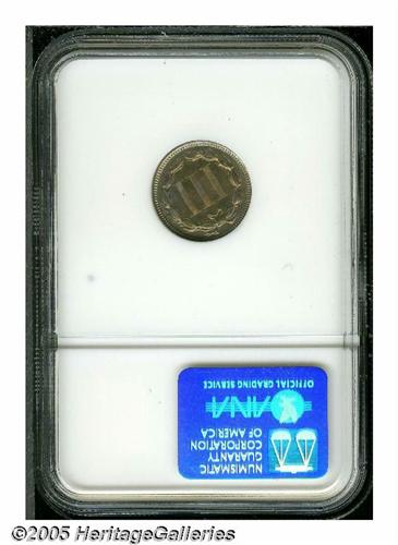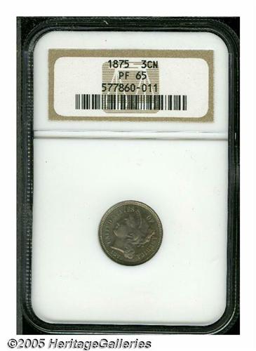 <B>1875<3CN> PR65 NGC.</B></I> Deep purple-rose on the obverse combines with golden luster on the reverse of this Gem proof. Free of serious imperfections, as expected, the reverse exhibits slightly above average definition.