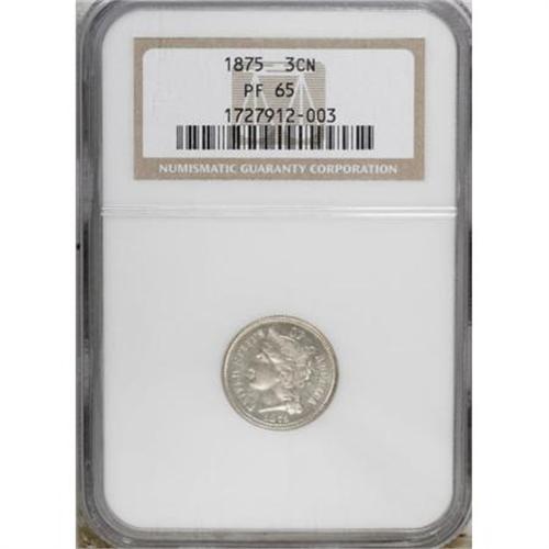 <B>1875 3CN PR65 NGC.</B></I> This satiny Gem has light golden toning and a penetrating strike. The obverse field has a pair of small mint-made strike-throughs, along with a lintmark behind the eye corner. Census: 65 in 65, 10 finer (10/07).<BR><BR><B>Coin Engraver:</B> James B. Longacre<BR><BR><b>Shipping:</b> Coins & Currency (<a target="_blank" href="http://www.heritageauctions.com/common/shipping.php">view shipping information</a>)