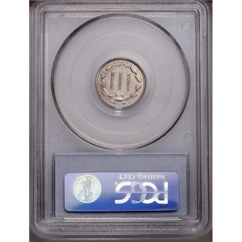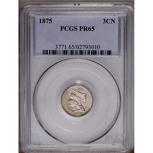<B>1875<3CN> PR65 PCGS.</B></I> Bright and untoned with somewhat soft striking details near the obverse center, especially for a proof specimen. As usual, heavy die striations vertically cross the reverse, but no post-minting anomalies seem evident on either side of the piece. An interesting flake of extra metal resides to the left of Liberty's ear, perhaps because of a flaw on the die. Population: 82 in 65, 12 finer (4/06).