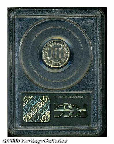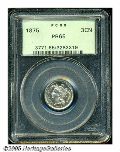 <B>1875<3CN> PR65 PCGS.</B></I> Bright silvery surfaces display just a hint of light tan-gold color, and are virtually devoid of significant marks. All of the design elements are well executed. Population: 80 in 65, 12 finer (6/05).