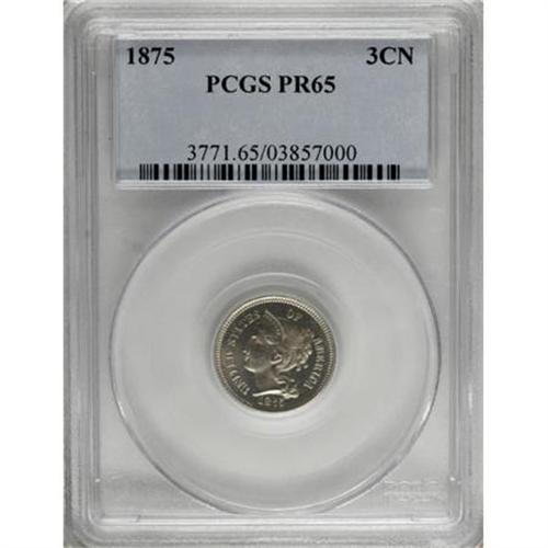 <B>1875 3CN PR65 PCGS.</B></I> The surfaces are uncommonly bright on each side, even though there is just a bit of light patina present. Population: 83 in 65, 13 finer (8/07).<BR><BR><B>Coin Engraver:</B> James B. Longacre<BR><BR><b>Shipping:</b> Coins & Currency (<a target="_blank" href="http://www.heritageauctions.com/common/shipping.php">view shipping information</a>)