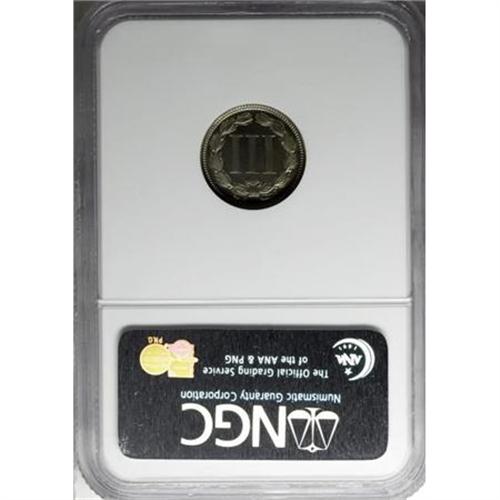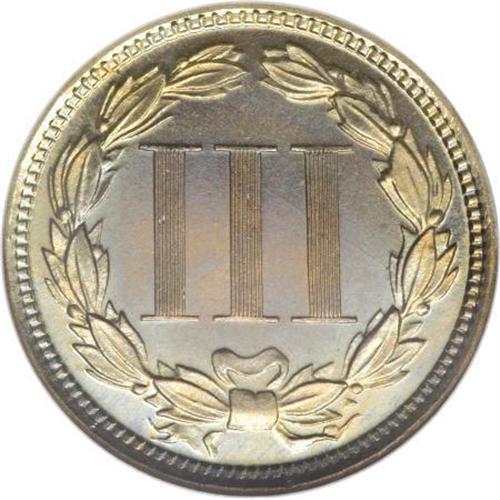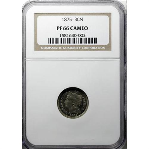<B>1875 3CN PR66 Cameo NGC.</B></I> Lovely original color is the hallmark of this delectable Premium Gem. An outer ring of sage yields to concentric circles of yellow, violet, and pink on both sides, a testament to long, careful storage without any attempts at "enhancement." Census: 3 in 66 Cameo, 0 finer (12/07).<BR><BR><b>Shipping:</b> Coins & Currency (<a target="_blank" href="http://www.heritageauctions.com/common/shipping.php">view shipping information</a>)
