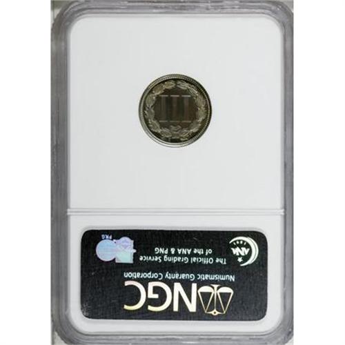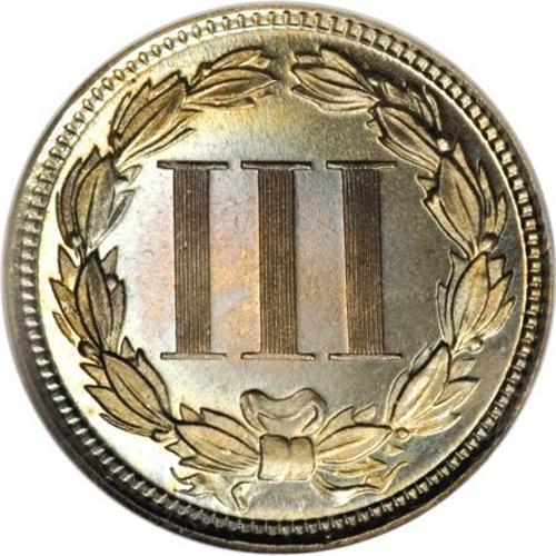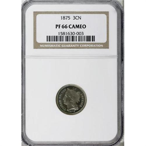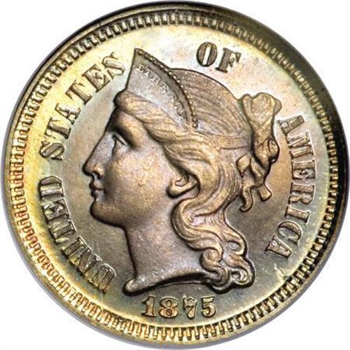 <B>1875 3CN PR66 Cameo NGC.</B></I> Lovely, original patina is the prime draw of this delectable Premium Gem. An outer ring of sage yields to concentric circles of yellow, violet, and pink on both sides, thin enough to leave the coin's essential contrast undimmed. One of just three Cameo coins at this level graded by NGC, with none finer (3/08).<BR><BR><b>Shipping:</b> Coins & Currency (<a target="_blank" href="http://www.heritageauctions.com/common/shipping.php">view shipping information</a>)