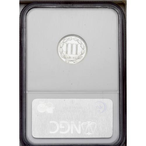 <B>1875<3CN> PR66 NGC.</B></I> This intricately struck Premium Gem has noticeable contrast between the portrait and the glassy obverse field. Brilliant save for a trace of gray toning above the wreath bow. Census: 10 in 66, 0 finer (4/06).