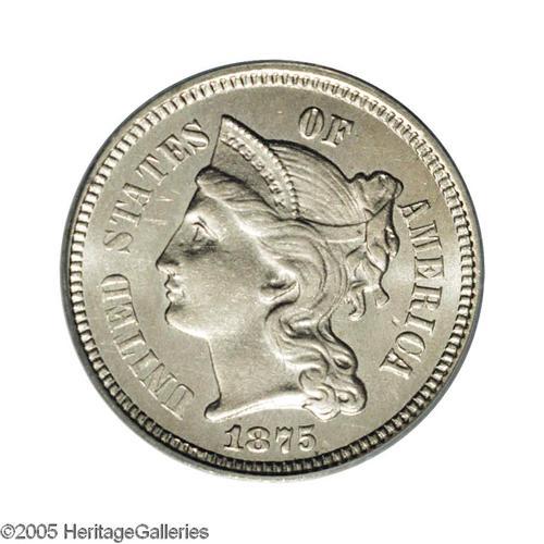 <B>1875<3CN> PR66 PCGS.</B></I> A well struck and undisturbed pearl-gray premium Gem, housed in a green label holder. A vertical lintmark within the hair is of mint origin. The traditional mintage of 700 pieces is somewhat low, since sales of individual pieces was not included. However, third party populations indicate this proof issue is very scarce overall, and becomes rare above the PR65 level. Population: 12 in 66, 0 finer (10/05).