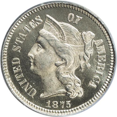 <B>1875<3CN> PR66 PCGS.</B></I> Fully struck and untoned, with bright, semi-prooflike fields. There are numerous die polish lines in the fields, and a couple of tiny contact marks on Liberty's cheek. Population: 12 in 66, 0 finer (3/06). <BR><BR><B>Important notice:</B> Heritage usually auctions material at the rate of 200-250 lots per hour. On some occasions eBay Live bid software or the Internet may not be able to keep up with the pace of the auction. We recommend placing a realistic absentee bid now as insurance to avoid disappointment. Occasionally the auctioneer may eliminate or reject an eBay Live bid, and the auctioneer may also reopen a lot after the close of the eBay live bidding (usually because we missed an audience bid), and may reject your bid even if it shows you as the winning bidder. By bidding via eBay Live, you agree that Heritage may award the lot to another bidder at its sole discretion under the circumstances described above or any other reasonable circumstances. Since eBay bids are not shown to us until we open the lot on the floor, we treat those bids just like floor bids. In most cases the floor responds before the eBay bid is presented to us, due to Internet lag time, so for consistency we have made it a policy that floor bids are always considered first over tie eBay live bids. Also please note that all Heritage lots purchased through eBay Live carry a 20% Buyer's Premium. Please make sure you read the Terms and Conditions before you bid. This lot is being auctioned in conjunction with a live floor auction by Heritage Galleries & Auctioneers. All final auction and invoice information will be supplied by Heritage Galleries & Auctioneers, and all other information should be considered preliminary. Lot:814 <BR><BR><B>Winning Notification and Billing:</B> After the FINAL session in this auction is complete, Heritage will send e-mail and snail mail invoices. This process normally takes several days. All final auction and invoice information will be supplied by Heritage Galleries & Auctioneers, and all other information should be considered preliminary. <BR><BR>This auction will be conducted on a live auction floor and over the Internet through eBay Live. If you choose to place an absentee bid, please take a moment to <font color='#0000ff'><u><a href='http://pages.ebay.com/liveauctions/help/before/laabsentee.html'>learn how eBay Live absentee bidding works</a></u></font><font color='#000000'>