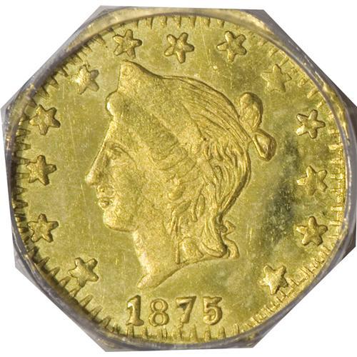 <B>1875/4 50C Liberty Octagonal 50 Cents, BG-931, Low R.7, MS64 PCGS.</B></I> Highly reflective with typical golden-green color. Struck from medallically aligned dies, well preserved, and showing a trace of charcoal-russet color below the crossbar of 7 in the date. The second edition of the BG reference lists only one PCGS MS64 coin, but it seems this may be a second example.<BR><BR><b>Shipping:</b> Coins & Currency (<a target="_blank" href="http://www.heritageauctions.com/common/shipping.php">view shipping information</a>)
