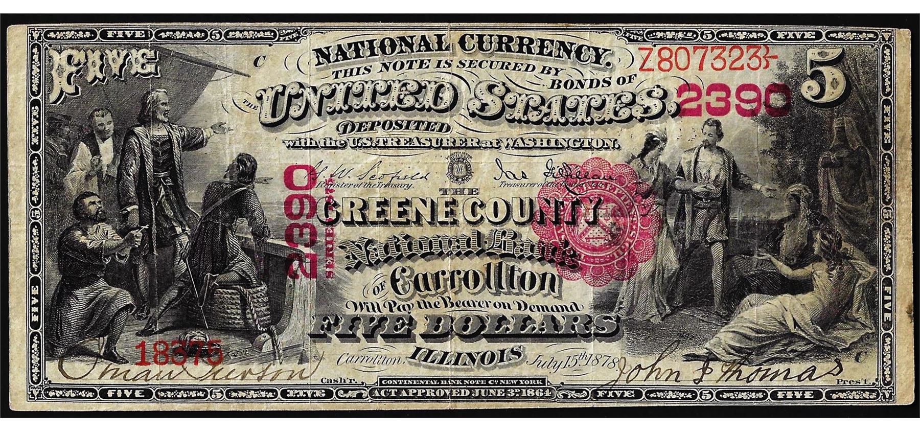 One 1875 $5 Greene County National Bank Carrollton, IL CH# 2390 National Currency Note.