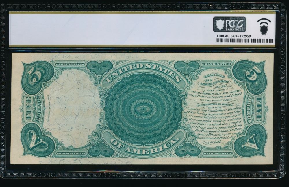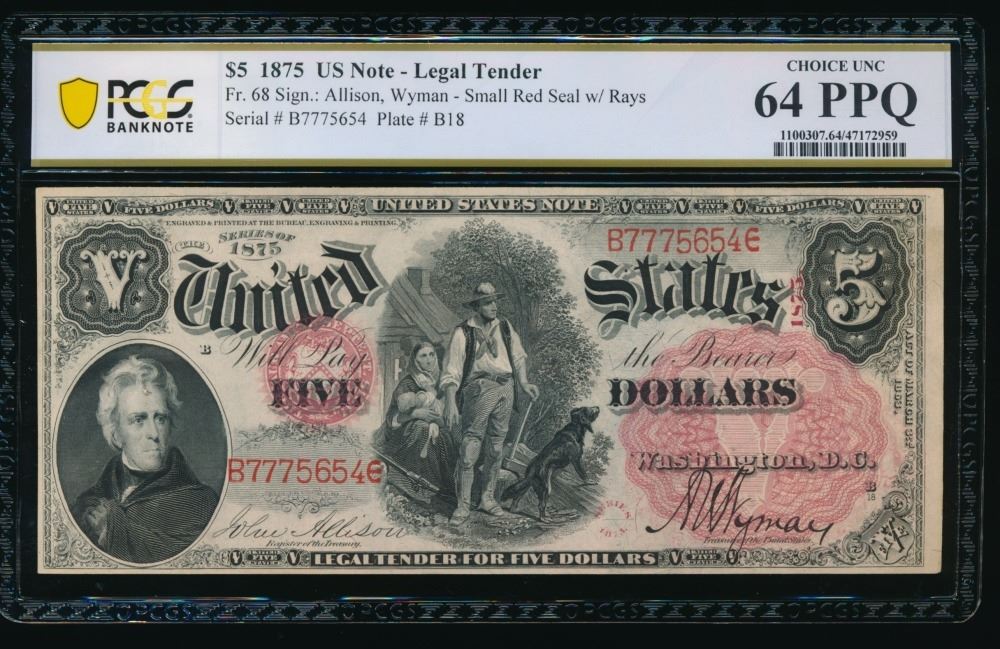 One 1875 $5 Legal Tender Note PCGS 64PPQ.