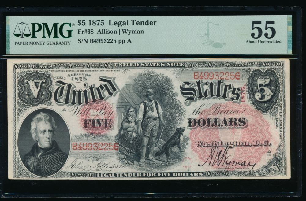 One 1875 $5 Legal Tender Note PMG 55.