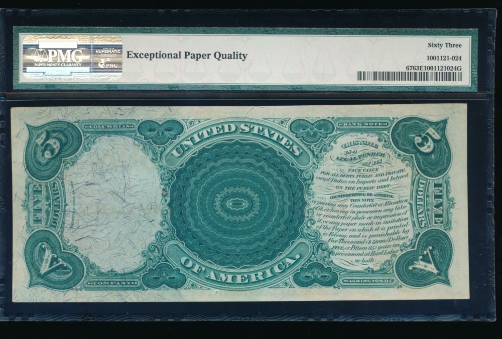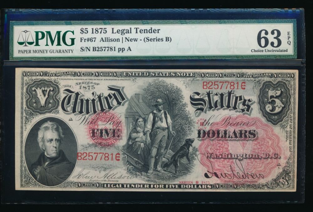 One 1875 $5 Legal Tender Note PMG 63EPQ.