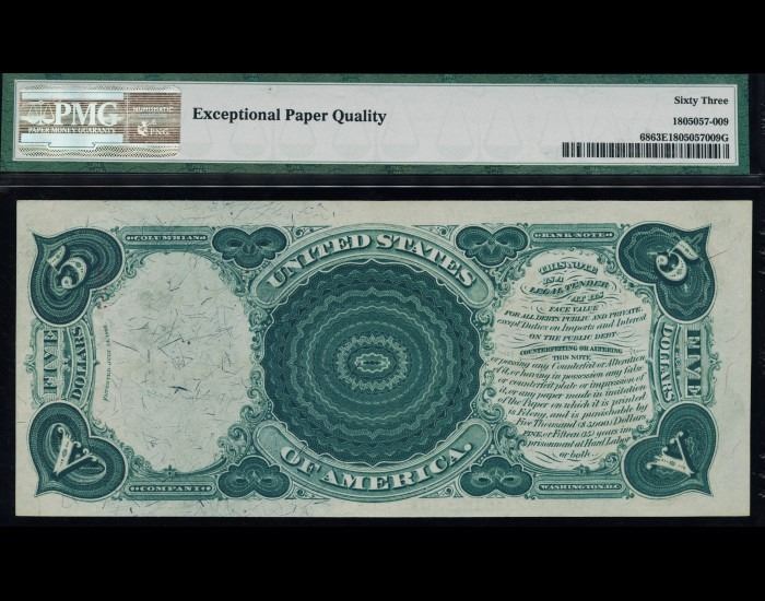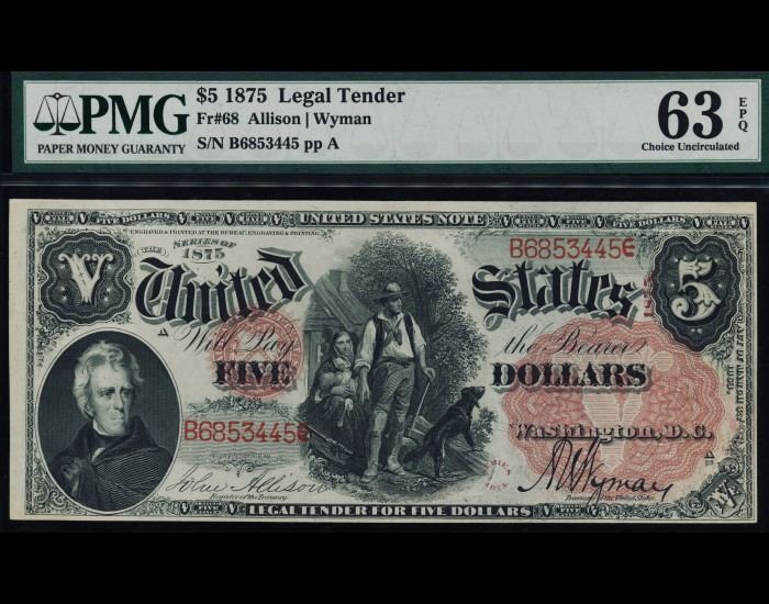 One 1875 $5 Legal Tender Note PMG 63EPQ.