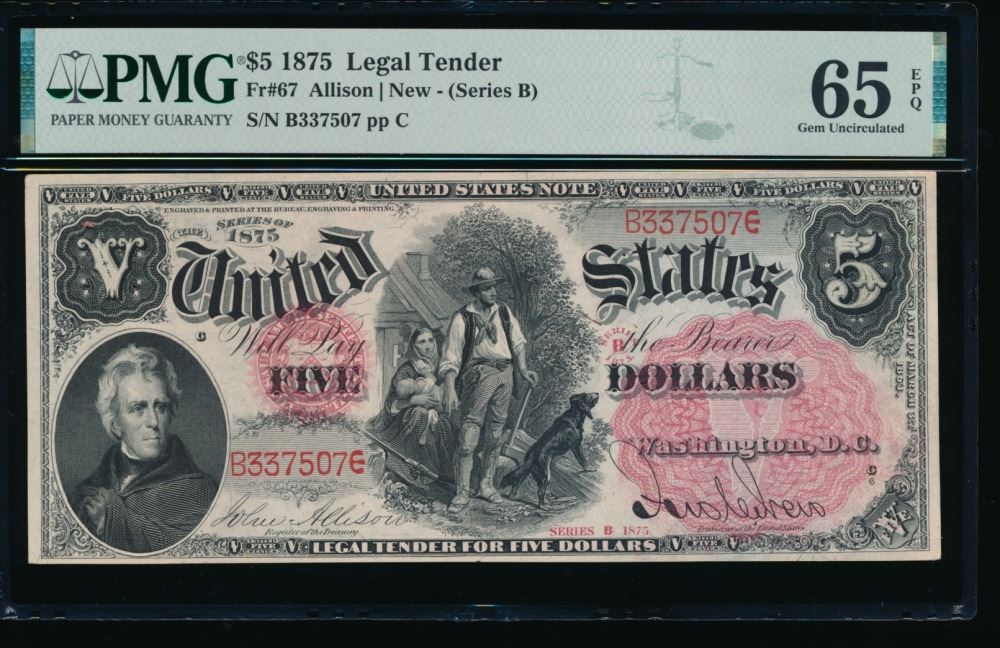 One 1875 $5 Legal Tender Note PMG 65EPQ.
