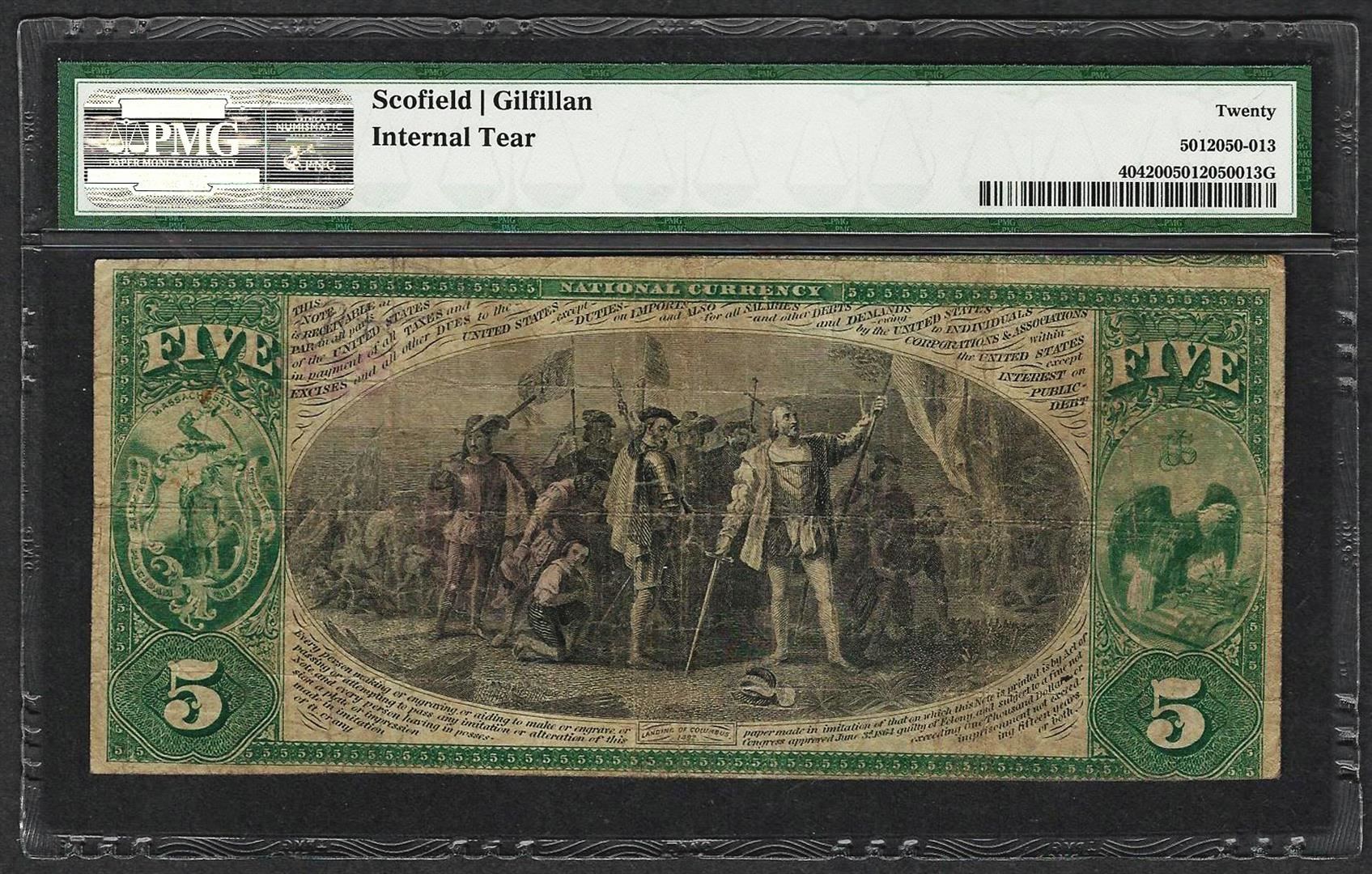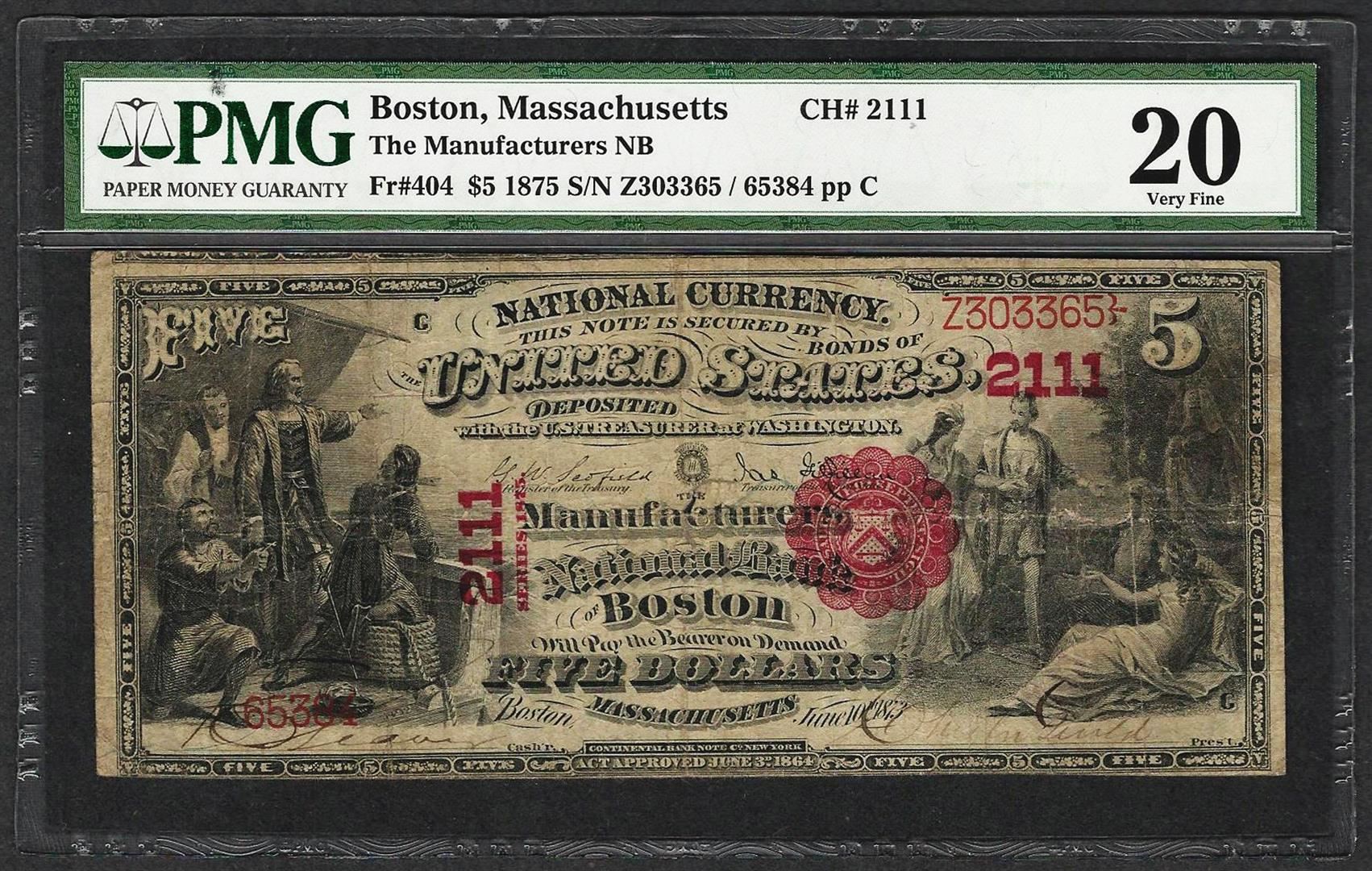 One 1875 $5 Manufacturers NB Boston, MA CH# 2111 National Currency Note PMG Very Fine 20. PMG Certified.